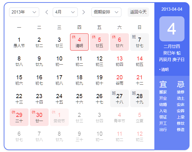 4月4日至6日放假調休,共3天。4月7日(星期日)上班。