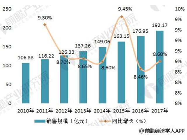 前瞻產(chǎn)業(yè)研究院發(fā)布的《2018-2023年中國低壓配電柜行業(yè)發(fā)展前景與投資預(yù)測分析報告》數(shù)據(jù)顯示,2010-2017年,我國低壓配電柜行業(yè)銷售額增長基本維持在8.4%以上。近兩年,由于宏觀經(jīng)濟進入新常態(tài)、電力投資增速不斷放緩等影響,低壓配電柜行業(yè)銷售規(guī)模增長較為穩(wěn)定。2017年,低壓配電柜市場銷售規(guī)模約為192.17億元,同比增長8.60%,僅較2016年提高了0.14個百分點。
