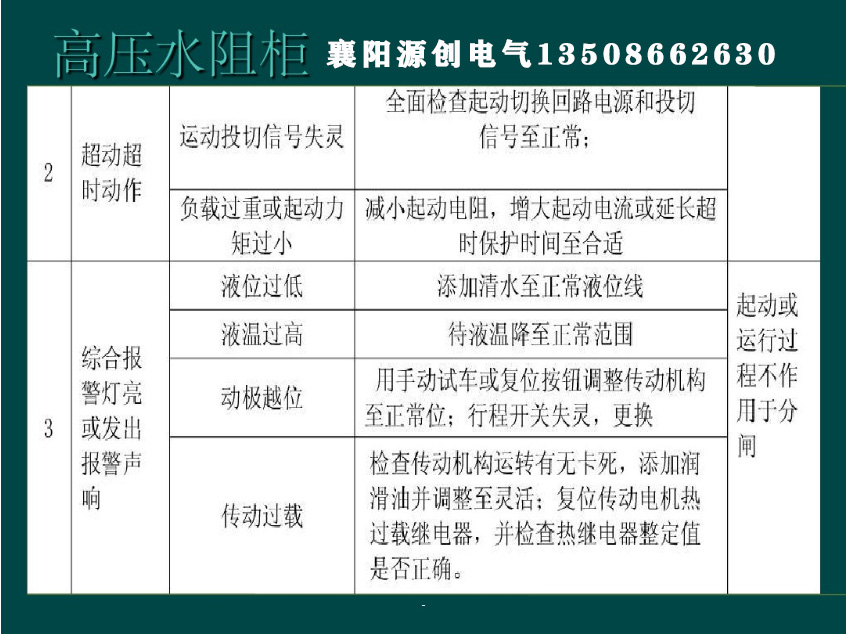 水阻柜廠家,液阻柜生產(chǎn)廠家,高壓液阻起動柜廠家說高壓水阻柜常見故障及處理方法: