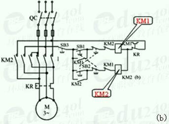 在圖(b)中,當(dāng)電動機(jī)正轉(zhuǎn)時,按下反轉(zhuǎn)起動按鈕SB2,它的常閉觸頭斷開,使正轉(zhuǎn)接觸器線圈KM1斷電,主觸頭KM1斷開。與此同時,串接在反轉(zhuǎn)控制電路中的常閉觸頭KM1恢復(fù)閉合,反轉(zhuǎn)接觸器線圈KM2通電并自鎖,電動機(jī)便反轉(zhuǎn)。同時,串接在正轉(zhuǎn)控制電路中的常閉觸頭KM2斷開,起聯(lián)鎖保護(hù)作用。