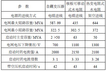 根據(jù)目前實(shí)際采集到的啟動(dòng)曲線情況來看, 這3 種啟動(dòng)方式都無(wú)特別明顯的優(yōu)勢(shì)和特別大的區(qū)別, 3 種不同的啟動(dòng)方式將電網(wǎng)的壓降值都控制在電網(wǎng)允許的范圍內(nèi), 啟動(dòng)電流的倍數(shù)都控制在額定電流的3 倍左右, 啟動(dòng)時(shí)間都控制在42~45 秒內(nèi)。由于各地現(xiàn)場(chǎng)的情況不完全一致, 實(shí)際運(yùn)行情況肯定受其他啟動(dòng)因素的影響, 所以認(rèn)為這3 種啟動(dòng)方式都是大型電機(jī)比較理想的啟動(dòng)方式, 其對(duì)電網(wǎng)產(chǎn)生的壓降大小除了和當(dāng)?shù)仉娋W(wǎng)容量有很大關(guān)系外,和其上級(jí)主變壓器的容量也有密不可分的關(guān)系。采取不同的電機(jī)啟動(dòng)方式啟動(dòng)空壓機(jī)時(shí)的技術(shù)參數(shù)比較見表1 。